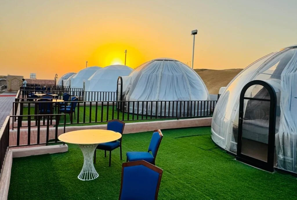 After an exciting evening, you will retire to a private air-conditioned chalet tent for a restful overnight stay. The tent, designed for two, includes a private washroom, shower, and toilet for maximum comfort. Enjoy overnight tea, coffee, and water while taking in the tranquil desert surroundings.